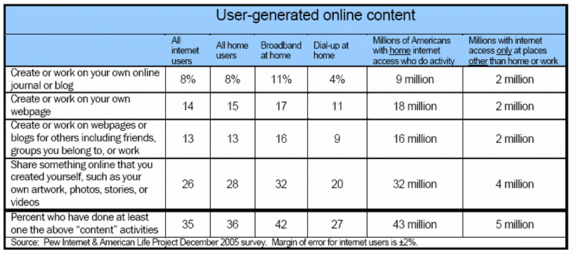 - Overall, 35% of internet users posted online content that fall into one of the categories listed below; that comes to 48 million American adults.