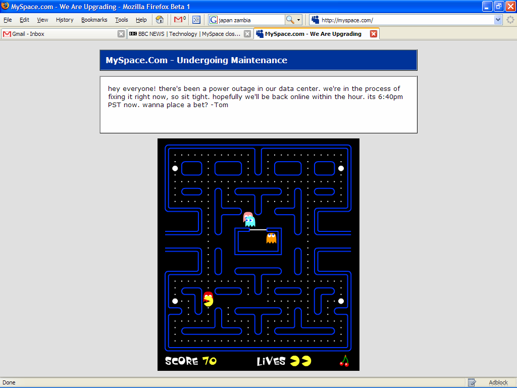 MySpace, one of the most active sites on the entire internet is down today, and its interesting the style and panache that they handle this with. A simple message, and a game of Pacman.