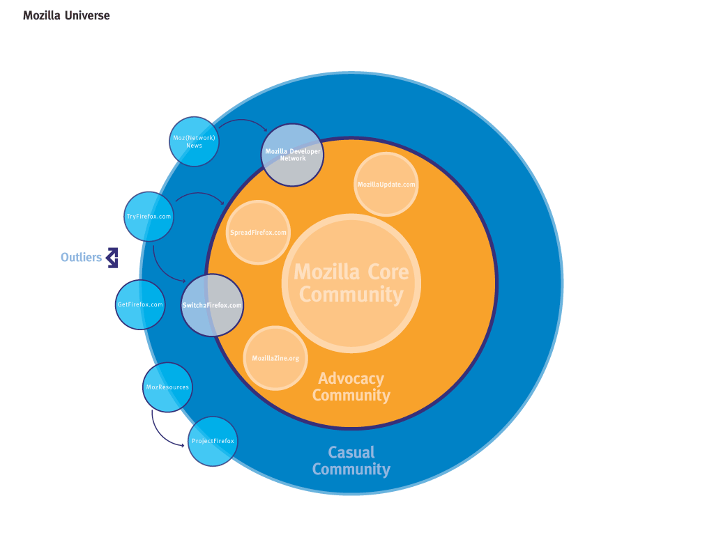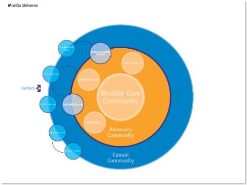 He has a handy picture here using the example of “Spread Firefox” and indicating how building out the core community first ensures clean, clear understanding that results in evangelism for your product or service.