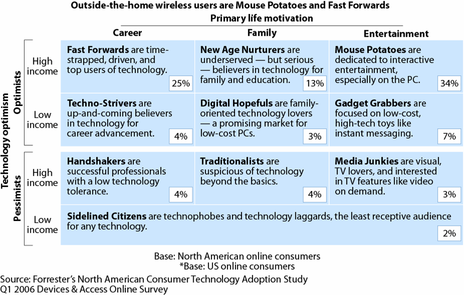This chart shows gives a snippet of background to the research, the categories of people are Forrester’s, taken from their Technographics research. Two groups, Fast Forwards, and Mouse Potatoes use wireless outside the home, and the rest are few and far between.