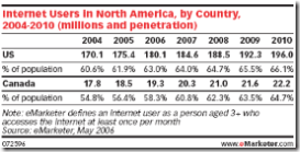 Some interesting stats from eMarketer on North American Internet and broadband penetration. These numbers seem lower than I had thought, but they follow usual eMarketer approach of summarising and aggregating other research, and it seems credible.