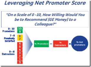 I heard of a North American Bank using this method to assess customer loyalty. I was skimming some GE analyst reports and surprise, they are using it too, and I’ll bet invented it.