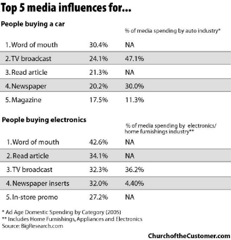Consumer rate word of mouth highest (30% for car, 43% for electronics). This bodes well for blogs, and social networks.