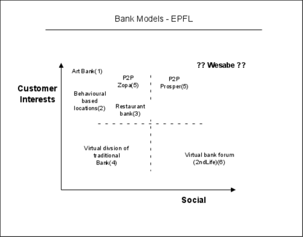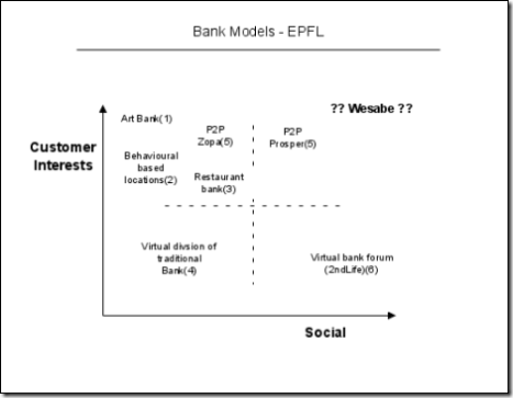 If I were to place traditional banks on this it would be mid high (left/y axis) left (lower/x axis). Today’s branches are placed based on population density and potential, which moderately reflect customer interests, but has zero social aspect.