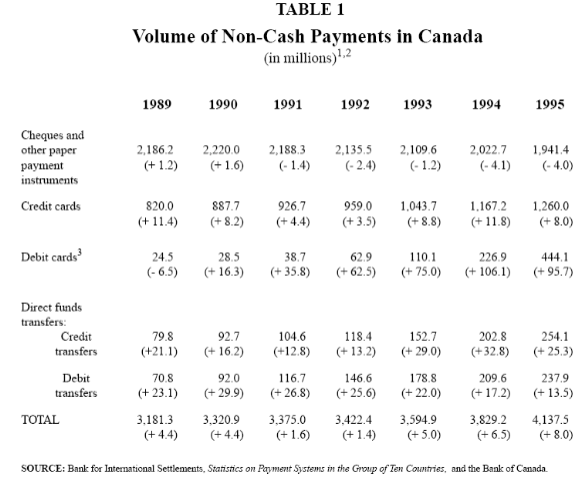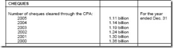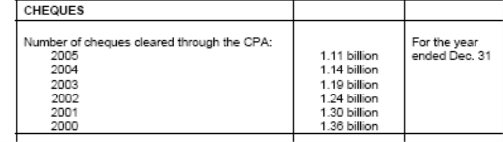 These are old stats from Canada, and followed by more recent ones. Whats interesting to me, is that cheques dropped but not by much. The generally accepted explanation is that business cheque writing has no diminished as much as expected in Canada at least. This would be the next big shift -B2B payments, to eliminate those cheques.