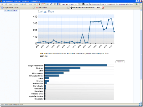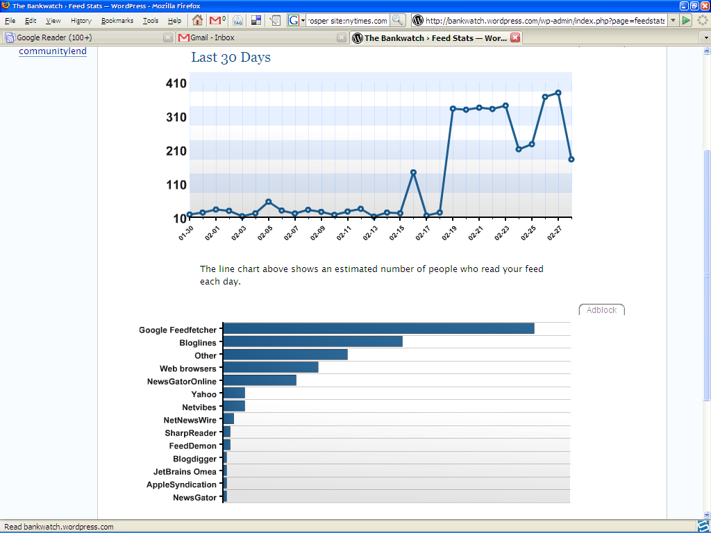 I literally haven’t the slightest idea how many people read my blog using RSS feeds. WordPress are trying hard to extrapolate the number, but it is so dynamic right now. My little blog is just trying to do its thing, but the Banker in me really wants consistent stats. This is a shortfall right now. Graph shown is RSS feed readership according to WordPress.