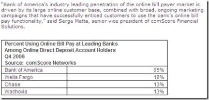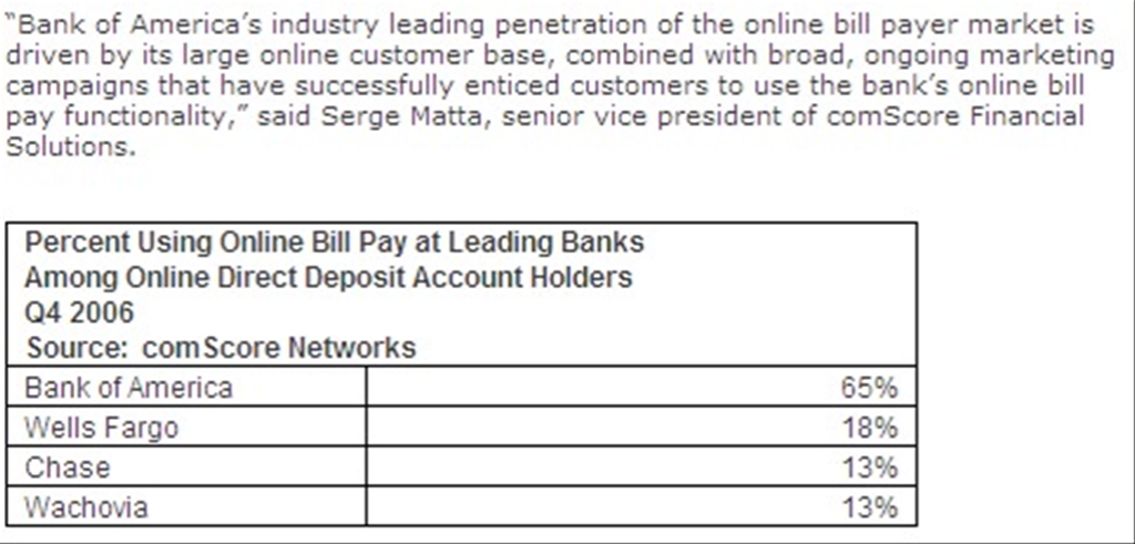 Uncategorized Bank of America Achieves Highest Adoption of Online Bill Pay Among Leading Banks, According to comScore Networks Bank of America leads the way in customer penetration for bill pay, in the US. Source: Bank of America Achieves Highest Adoption of Online Bill Pay Among Leading Banks, According to comScore Networks Technorati tags: bill+pay, BofA, Bank+of+America Rate this: Related