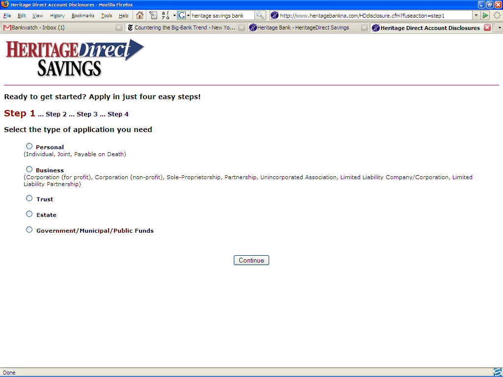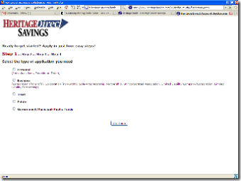 - Heritage: what appears to me to be a home grown online application, that is very slick and simple. Its a four step process, and 2 of the 3 are “agree to terms and conditions” so its very fast. From my own observation of the application, it looks like this one was built by Heritage. So this is a great example of the opposite end of the spectrum from the Cashedge approach. Less sophisticated in terms of functionality that might require more manual intervention, but very smooth and simple for customers.