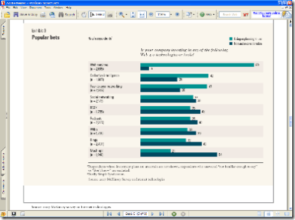 Interesting survey noted here at Finextra, completed by McKinsey. It indicates web services, and internal p2p, collective intelligence activities are preferred over wikis’ blogs and podcast’s.