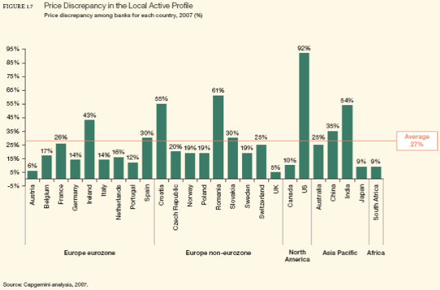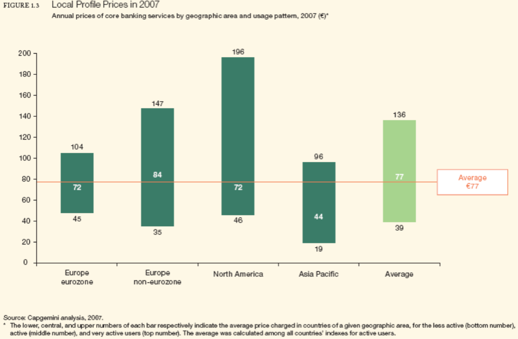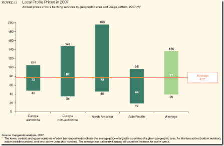 The average fee is €77 but the thing that stands out as it did in previous reports, is the North American picture. North Americans pay through the nose for banking – no doubt there. Asia is cheapest, and Europe has the narrowest distribution (least competition?). Hat tip to Chris Skinner for this one.