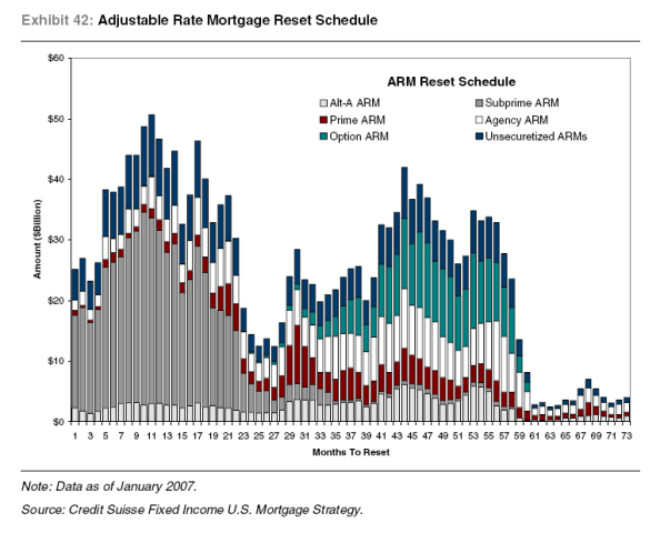 Let’s focus on the biggest risk loans — the one we were just pondering the fate of — the sub prime loans! These risky loans are colored in dark grey. One quick glance at the graph shows the disturbing news. The second half of ‘07 through the first half of ‘08 has an absolute ton of subprime loans resetting all at once. With the housing market cooling off, these loans are primed for foreclosures and/or owners forced to sell. This is when the housing market will face a serious challenge.
