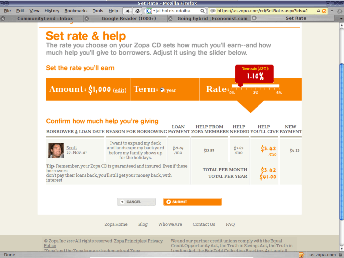 US Zopa launched a preview this morning, and this screen shot shows how the depositor (not a lender) can reduce their interest, and that reduction goes to support the payments of a friend borrower. I wonder how much this model will provoke interest.