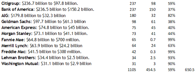 The market capitalisation reductions in just these Banks shown, alone work out to $651 billion since October 9th, 2007. Its an average of 59% down, ranging from 38% to 99%.
