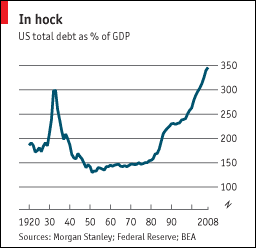 A cut in overall lending would be a complete reversal of trend. Morgan Stanley reckons that total American debt (ie, the gross debt of households, companies and the government) has risen inexorably since 1980 to more than 300% of GDP (see chart), higher than it was in the Depression. Consumers, in particular, were encouraged to borrow by low unemployment and interest rates and (until last year) rising asset prices. Their debt jumped from 71% of GDP in 2000 to 100% in 2007, a bigger increase in seven years than had occurred in the previous 20.