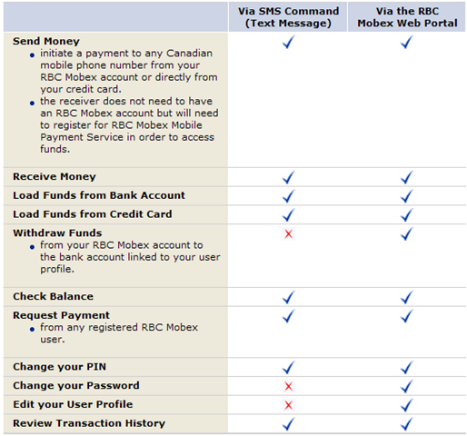 The RBC solution is a ‘stored wallet’ solution, where you upload funds from credit card or bank account then you can use the following transactions, courtesy of rbcmobex.com