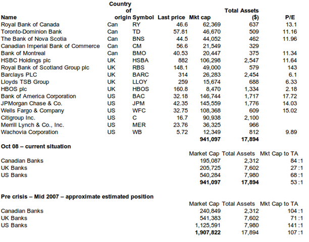 The degree of shift that has occurred and is occurring as we speak with respect to bank valuations is simply staggerring. What got me going on this was when I noticed that the combined market capitalisation (stock exchange value of a company) of Lloyds Bank, Barclays, and HBOS was less than several of the Canadian banks. So with the valuable assistance of Google Finance here are some statistics, with some notes following.