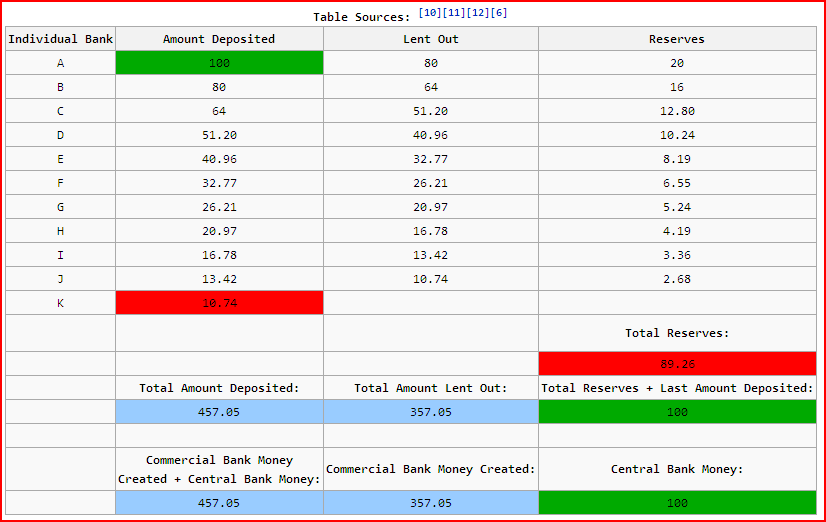 This got me thinking about economics 101 and the multiplier effect of money. This from wikipedia summarises the effect of a $100 purchase. As that amount is received and deposited to a bank, that bank holds its reserve, in this example $20) and lends out $80. The $80 is deposited, and so on. The additional money created by that first transaction was $357.05, with the other $100 retained as bank reserves.