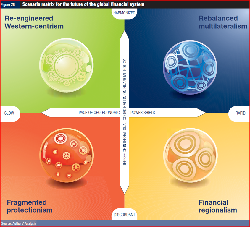 The report, The Future of the Global Financial System deals with this unpredictable future by outlining four scenarios that encapsulate the broad sets of potential directions that will occur in the worlds banking ecosystem. As with Part 1 the research used to source this series is primarily from The Future of the Global Financial System together with supporting data from G20, and IMF. I also acknowledge strong influences from Niall Fergusons “The Ascent of Money” and his other writing here at the Financial Times plus John Maudlins pragmatic view of the world.