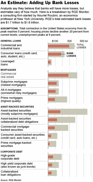 The amounts are alarming. Bear in mind these amounts will also have been securitised and purchased by banks elsewhere. The above statistics suggest that even Roubini’s estimate (courtesy of John Maudlin) of 50- 60% of US bank assets being bad could in fact be optimistic.