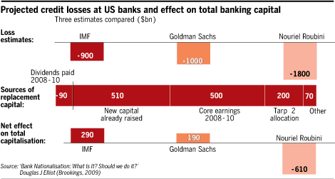 The final piece of the puzzle is the amount, and here I am a little surprised at the relatively small size of $500bn, with government money of $75 – $100bn in that allotment. Given that US projected losses are valued at between $900bn and $1,800bn, the PPPIP plan seems small. [update: Geithner piece in WSJ indicates the amount can be raised to $1,000bn]