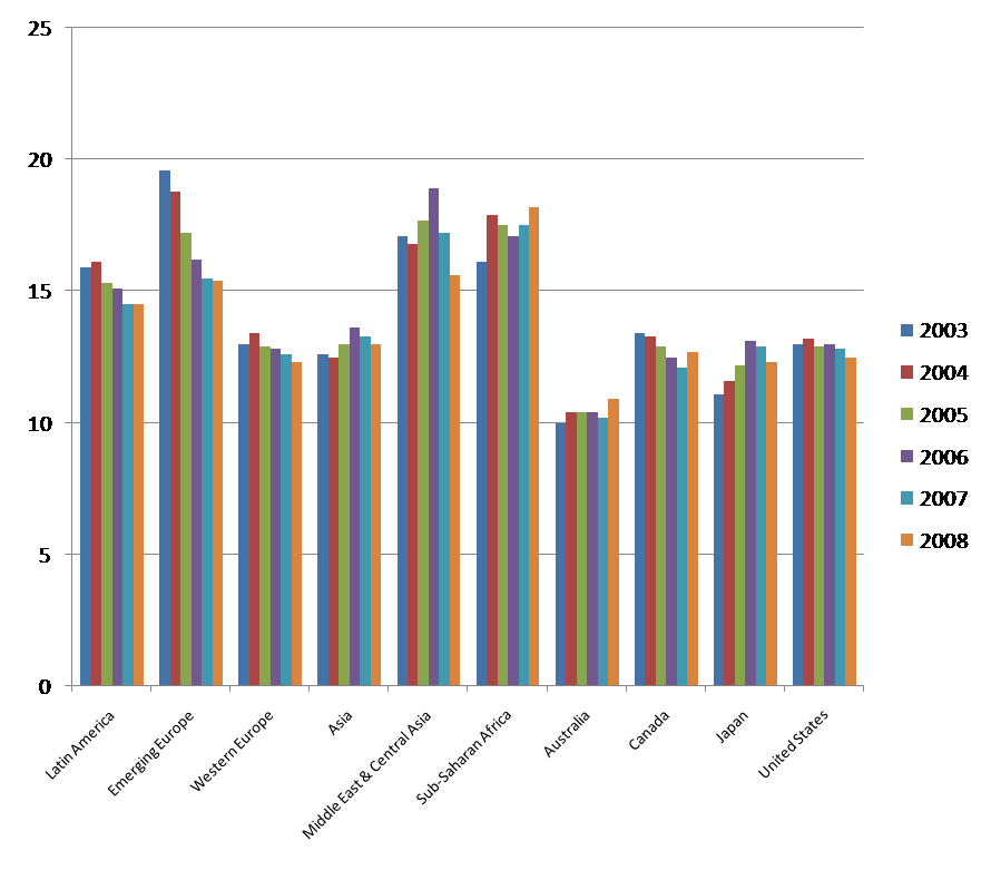 Note the negative trends in most except Canada, and this is based on the latest data to end of 2008. Use the thumbnail for a larger version that is clearer.