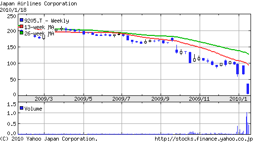 Anyhow, in related news, yet another bastion of the old economy is in dire straits. JAL (Japan Air Lines) began in 1951, first flew to San Francisco in 1954, and in 1987 became 100% public owned. In 2002, JAL took over JAS (Japan Air Systems). 2009 November was their worst financials. JAL stock has dropped from ¥210 to ¥4 today.