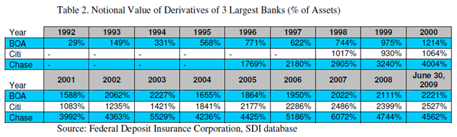 The data on derivatives is impressive. JPMorgan Chase, for example, held derivatives worth 6,072 percent of its assets at the peak of the bubble in 2007. The other two giants, Citigroup and Bank of America, although still far behind Chase, had 2,022 percent and 2,486 percent respectively. Goldman Sachs, the other giant, had an astonishing amount of derivatives on its balance sheets: 25,284 percent of assets in 2008 and 33,823 percent as of June 2009. Citigroup and BOA now have more of this risk on their books than before the crisis (FDIC SDI database).