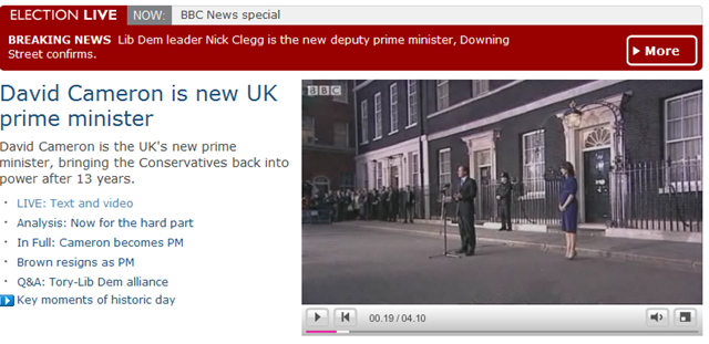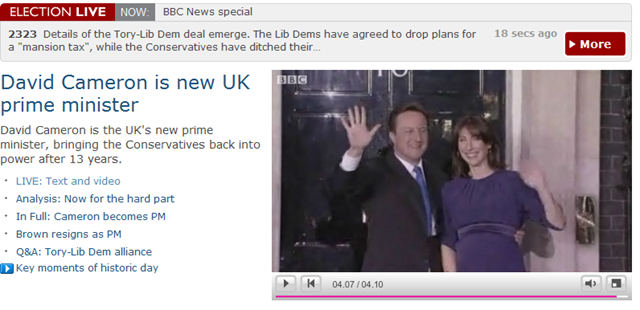 It was fascinating to follow the finale of the UK election today. David Cameron is the new PM and Gordon Brown is already back in Kircaldy. It was also a testament to internet that I could follow the entire thing online.