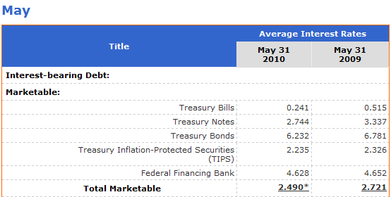 Note that in the period to May 2010 The US Government paid $152 bn compared to $124 bn a year earlier. The interest paid will include various maturities but if you take the long view you can see where this is headed.