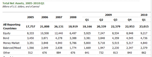 From the same article I came across this statistical review of investment shifts since before and after the crisis. It seems to show that net assets have relatively shifted to cash assets, and that equities are still 25% below 2007 values.