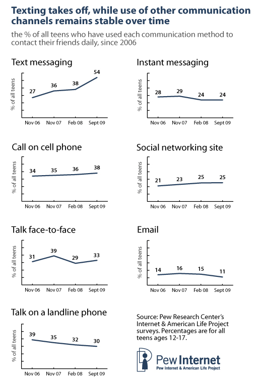 As soon as I saw these stats I immediately thought of Ron Shevlin. The observations about teens immediately suggest that we should transfer all future communication to text messaging and eliminate all email communication. Why you ask? Teen usage of texting has leapt 100% over the last 3 years, whereas email has dropped 25%. Social networking is relatively flat so forget about Facebook. Face to face shows some growth so people will still talk to each other so pubs remain fine.