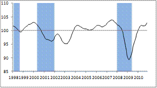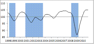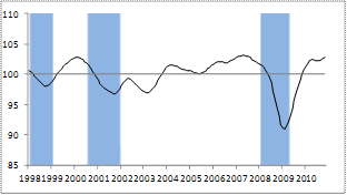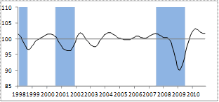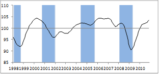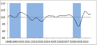 The key is getting above 100 and staying there. 100 = steady state, no growth or drops. Note the large drop in 2008.