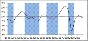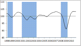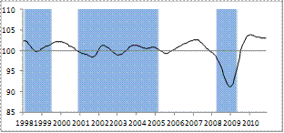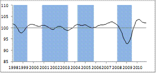 The above graphs show for each country the outlook for economic activity based on the CLIs. CLIs attempt to indicate turning points in economic activity approximately six months in advance. Shaded areas represent observed downswings (measured from peak to trough) in the de-trended industrial production (the reference series for economic activity).