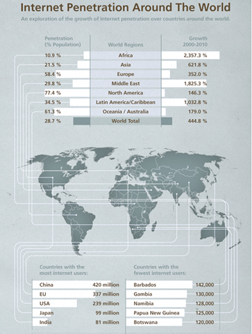 The thing that surprised me about this view of worldwide internet penetration was India particularly compared to China considering both countries have similar populations. I am aware of the poverty in India and is that the reason? Is India that much more poor than China who have 1/3 of their population online? I wonder if there is something more in terms of lack of infrastructure.