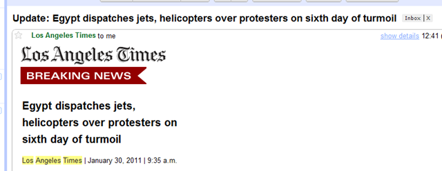 What matters with events such as #egypt is first and foremost breaking news. For example earlier today military jets and helicopters buzzed Tahrir Square in Cairo. This occurred sometime between dawn and noon local time, or 2am and 9am EST. The LA Times sent me their breaking news email on the jets buzz over at 12:41pm EST. This is hardly breaking news. The American networks in particular see all news through the lens of American reaction. First let us get the facts straight so that the political reaction can be placed in proper context.