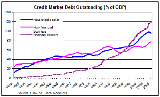 Why did the markets inexplicably freeze on the week of September 14th, 2008? This tight reliance between each other because of interbank lending at record levels could be one legitimate reason for interbank trust literally falling off a cliff. The graph shows growth in financial sector lending from negligible in the 60’s to 25% higher than consumer debt in 2008.