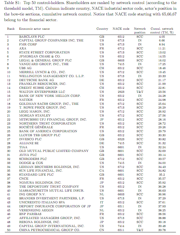The 1,318 represent 3.2% by number of all transnational companies. The thing that is most illuminating is the dramatic degree of control exercised by banks (40% of ownership). This actually surprised me until I read deeper.