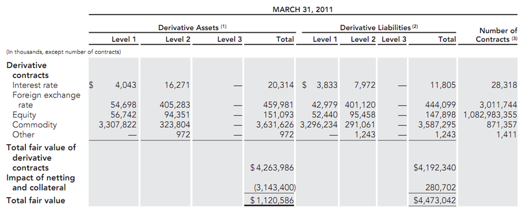 Next and most important, being the thing that brought them to down, lets look at off-balance sheet items. Again from their own financial statements here is their derivative position. There are $1.1 Bn on the asset side, and $4.5Bn on the liability side or $3.4 Bn or two and a half times capital base.