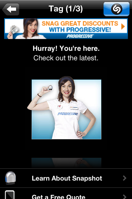 I just saw an interesting use of Shazam. There was an ad on TV for Poregressive Insurance, and there was a small icon in the ad that said something like “Shazam for more information”. I listened with Shazan, and here is the result: