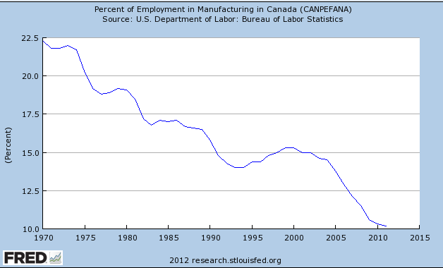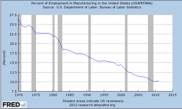 Unfortunately the FRED database does not contain data on China but this from the BLS database shows the US and China to be similar in terms of % of employment associated with manufacturing. “This article has demonstrated that manufacturing employment in China increased during the 1980s and early 1990s, peaked in about 1995–96, declined during the late 1990s until 2000–01, and increased again in 2002.”