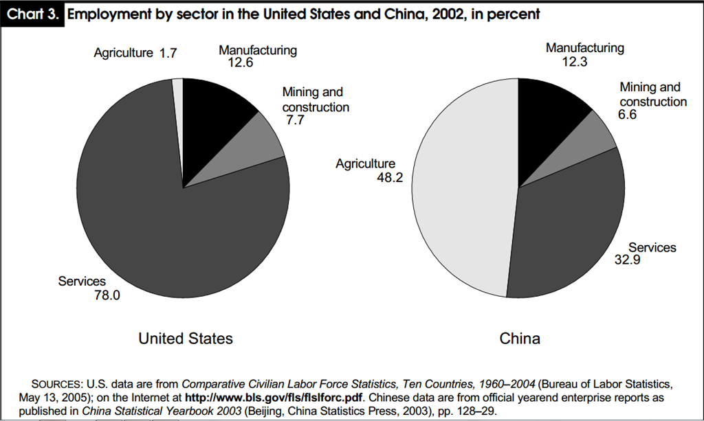 The other difference lies in the rest of the economy. The Chinese alternative is to remain in agriculture which pays less. The US alternative is to join services.