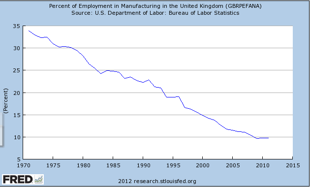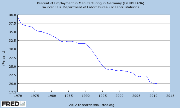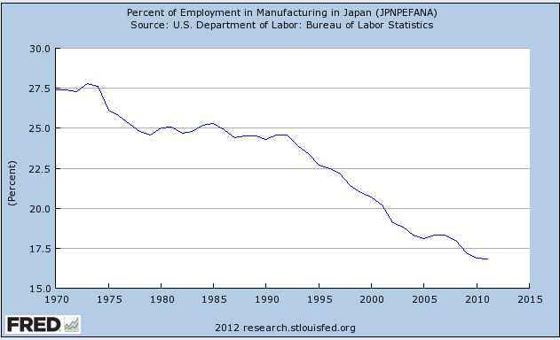 Here from FRED is the trend lines for the other Western and Japan economies. Virtually identical to US. The role of manufacturing in the West was lost long ago.