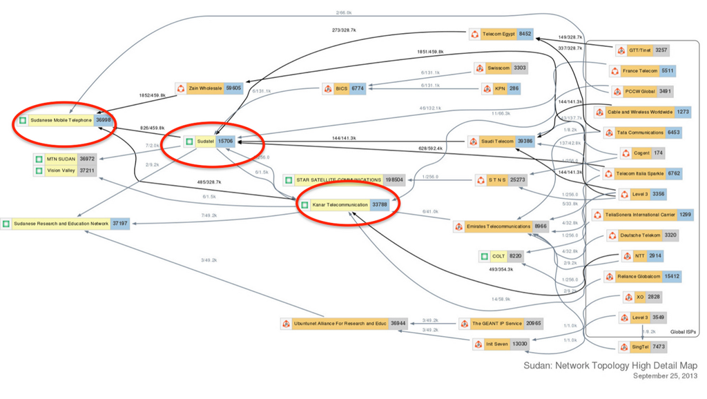 Sudan just lost all internet. What is fascinating about this, aside from the poor Sudanese people and what is happening to them, is the ease with which internet can be cut off. We saw this in Egypt in 2011 and now Sudan. This picture and the post from Renesys shows that Sudan has 3 gateways from the outside that control all internet into Sudan.