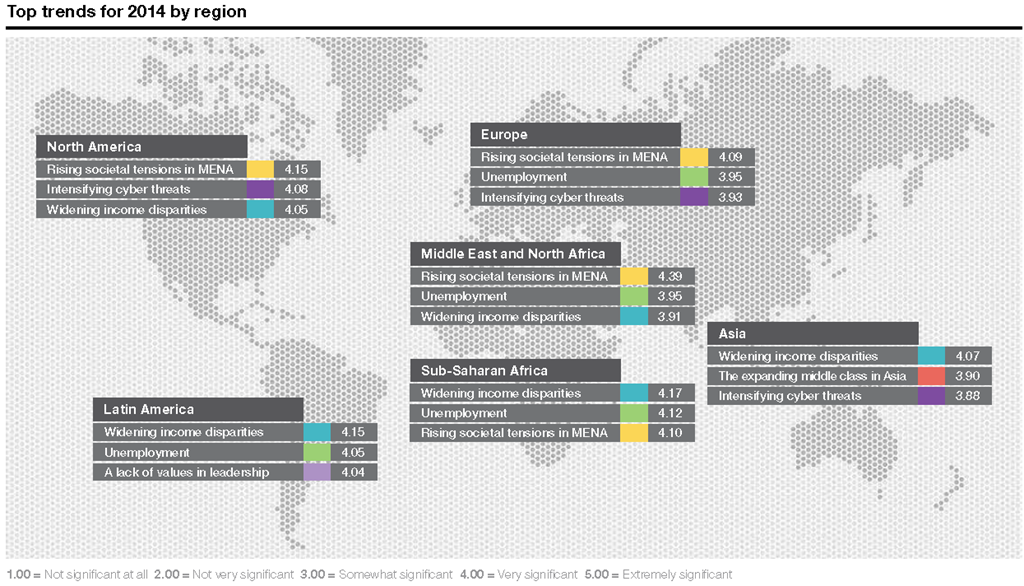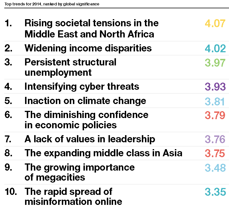 The always thoughtful and complete World Economic Forum (WEF) in Geneva have produced their annual Global Agenda Outlook Report for 2014. Local copy here. (37mb pdf)