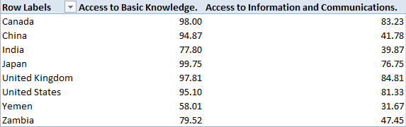 The result assesses most countries in the world but I took a subset of countries and only two index summaries, i.e. access to basic knowledge (think % of children at school) and access to information and communication (think % of people with mobile phones).