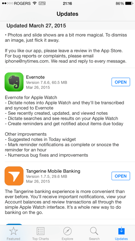In this case it was Apple Watch. Everything from NY Times and Evernote to Tangerine Online Banking. Curious to see how Tangerine (Scotiabank) handles Apple Watch.
