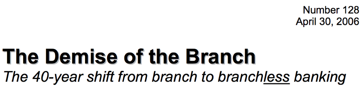 Today the shift away from branches that began with Barclays and other UK banks 8 years ago has finally taken hold. The idea of a large bank being branchless is no longer a dream. There are many banks using the concept of shift to sales offices as a teaser, but the reality is that the traditional $1 million + branch with tellers, cash and vault infrastructure is now defunct.