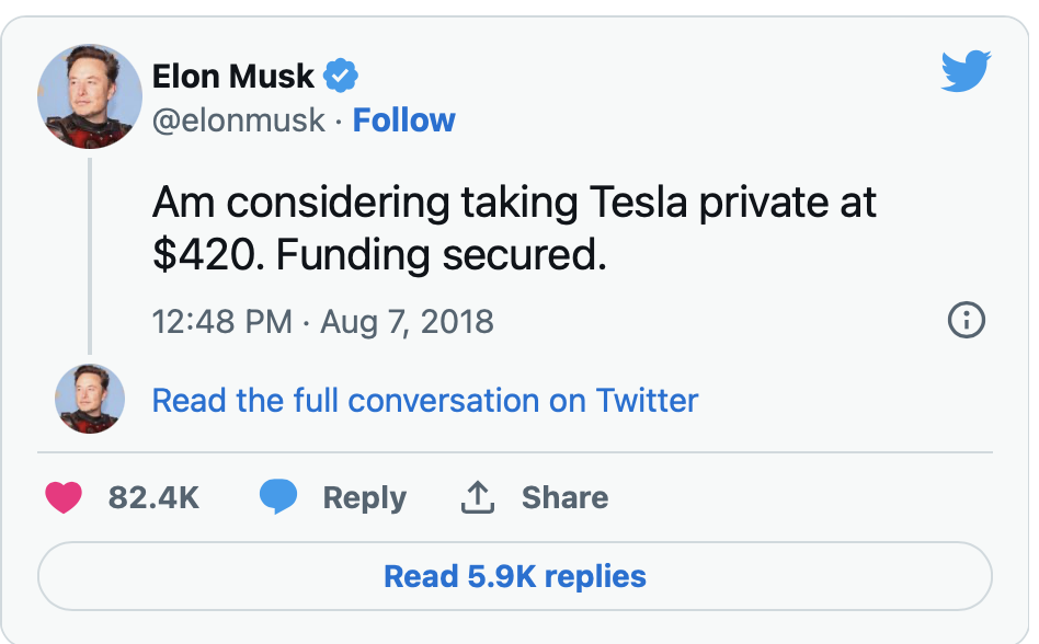Investors contend Tesla’s CEO was intentionally deceitful when he tweeted the go-private proposal to his millions of Twitter followers on Aug. 7, 2018, adding that the transaction was buttressed by “funding secured.”