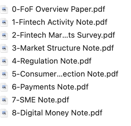 Box 1. Fintech and the Future of Finance Technical Notes Data trends and market perceptions 1. Global Patterns of Fintech Activity and Enabling Factors (Fintech Activity note) by Tatiana Didier, Erik Feyen, Ruth Llovet Montanes, and Oya Ardic 2. Fintech Market Participants Survey (Fintech Market Participants Survey) by Erik Feyen, Harish Natarajan, Guillermo Rabadan, Robert Paul Heffernan, Matthew Saal and Arpita Sarkar Policy issues 3. Fintech and the Digital Transformation of Financial Services: Implications for Market Structure and Public Policy (Market Structure note) by Erik Feyen, Jon Frost, Leonardo Gambacorta, Harish Natarajan, and Matthew Saal 4. Regulation and Supervision of Fintech: Considerations for EMDE Policymakers (Regulation note) by Tatiana Alonso Gispert, Pierre-Laurent Chatain, Karl Driessen, Danilo Palermo and Ariadne Plaitakis with contributions from Ana M. Carvajal and Matei Dohotaru 5. Consumer Protection Implications of Fintech (Consumer Protection note) by Gian Boeddu and Jennifer Chien Specific fintech products 6. Innovation in Payments: Opportunities and Challenges for EMDEs (Payments note) by Dorothee Delort and Jose Antonio Garcia Garcia Luna 7. Fintech and SME Finance: Expanding Responsible Access (SME note) by Ghada Teima, Ivor Istuk, Luis Maldonado, Miguel Soriano, and John Wilson 8. What Does Digital Money Mean for EMDEs? (Digital Money note) by Erik Feyen, Jon Frost, Harish Natarajan, and Tara Rice |