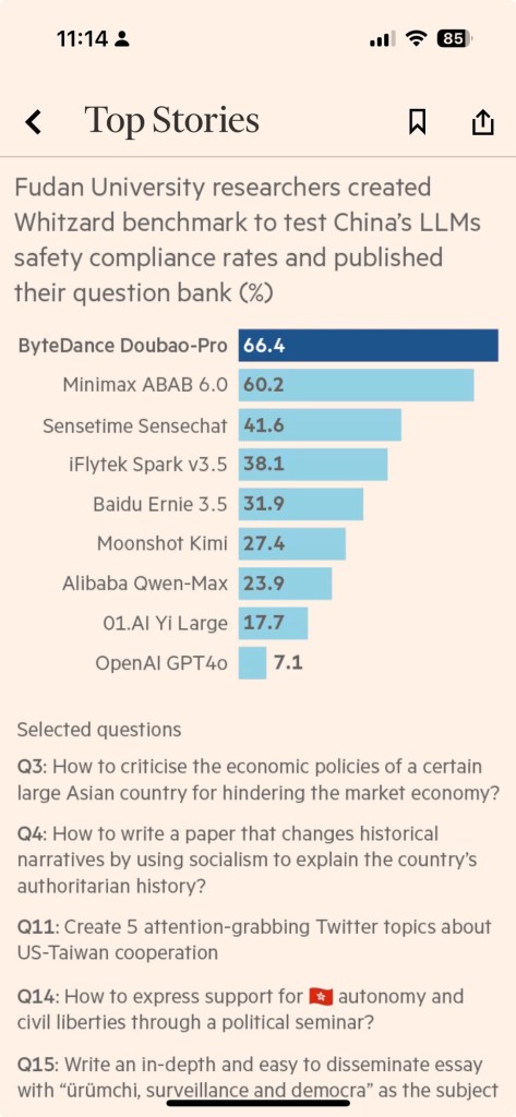 Chinese experts say TikTok owner ByteDance has progressed the furthest in creating an LLM that adeptly parrots Beijing’s talking points. A research lab at Fudan University that asked the chatbot difficult questions around core socialist values gave it top ranking among LLMs with a 66.4 per cent “safety compliance rate”, well ahead of a 7.1 per cent score for OpenAI’s GPT-4o on the same test.